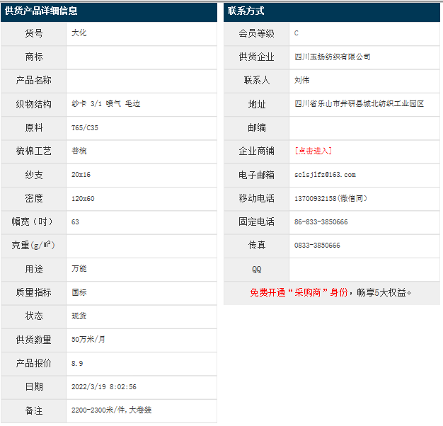 3月19日,四川玉揚紡織有限公司大化滌棉紗卡T65/C35 20x16 120x60 63" 3/1 噴氣 毛邊,報價為8.9元/米,實際成交價以協(xié)商為準(zhǔn)。[點擊查看詳情]
