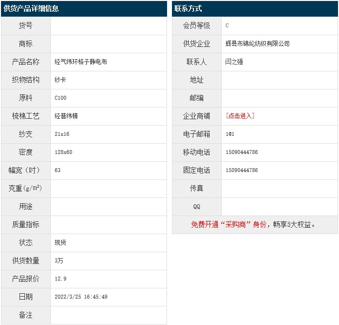 3月25日,輝縣錦綸紡織有限公司格子靜電布C100 21(OE)xJ16 128x60 63",報價為12.9元/米,實際成交價以協(xié)商為準(zhǔn)。[點擊查看詳情]