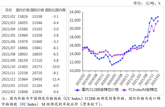 (一)國內(nèi)棉價(jià)環(huán)比上漲。本月,紡織企業(yè)節(jié)后開工普遍較早,隨著原料庫存逐漸消耗,企業(yè)采購意愿有所增強(qiáng),推動(dòng)國內(nèi)棉價(jià)繼續(xù)上漲。據(jù)《中國棉花工業(yè)庫存調(diào)查報(bào)告》數(shù)據(jù),2022年2月企業(yè)棉花平均庫存使用天數(shù)約34.3天,環(huán)比增加2.5天,同比減少16.6天,比近5年同期平均水平減少6.6天。準(zhǔn)備采購原料企業(yè)占56.7%,環(huán)比增加6.7個(gè)百分點(diǎn),同比增加5.9個(gè)百分點(diǎn)。2月國內(nèi)3128B級棉花月均價(jià)每噸22848元,環(huán)比漲1.5%,同比漲44.4%。鄭棉期貨主力合約(CF205)月結(jié)算價(jià)每噸21506元,環(huán)比漲0.7%,同比漲35.4%。