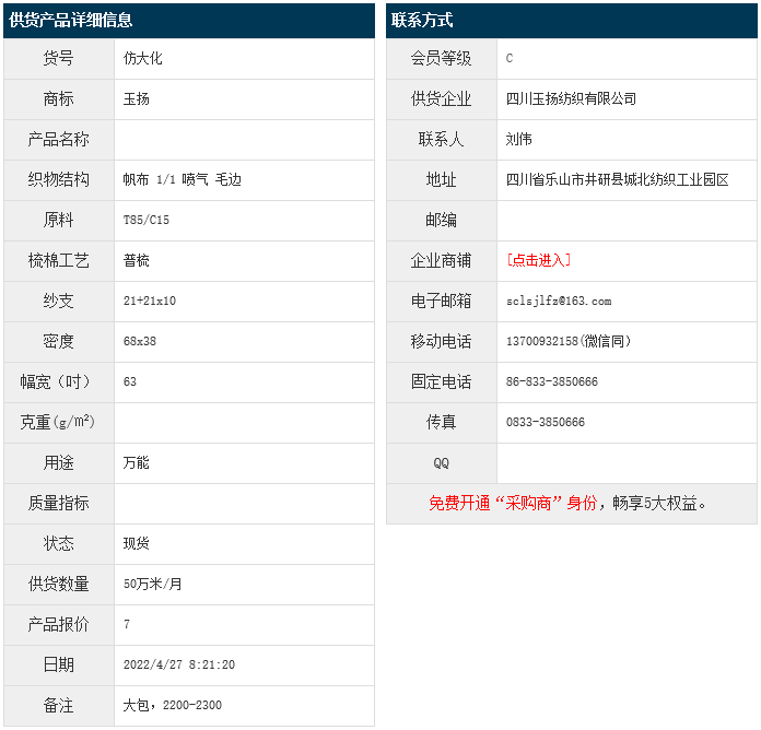 4月27日,四川玉揚(yáng)紡織有限公司仿大化滌棉帆布T85/C15 21+21x10 68x38 63" 1/1 噴氣 毛邊,報(bào)價(jià)為7元/米,實(shí)際成交價(jià)以協(xié)商為準(zhǔn)。[點(diǎn)擊查看詳情]
