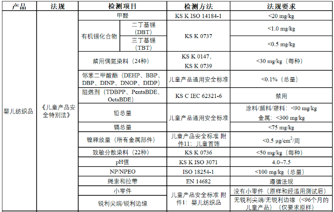 韓國《兒童用品通用安全標(biāo)準(zhǔn)制定和安全確認(rèn)法 附錄1:嬰兒紡織品》https://www.kats.go.kr/content.do?cmsid=530&mode=view&page=&cid=22720