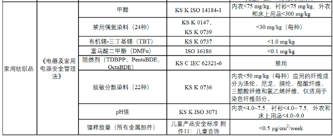 韓國《工業(yè)產(chǎn)品質(zhì)量管理和安全控制法——安全質(zhì)量標(biāo)志法 附錄1:家用紡織品》https://www.kats.go.kr/content.do?cmsid=527&mode=view&page=&cid=22718