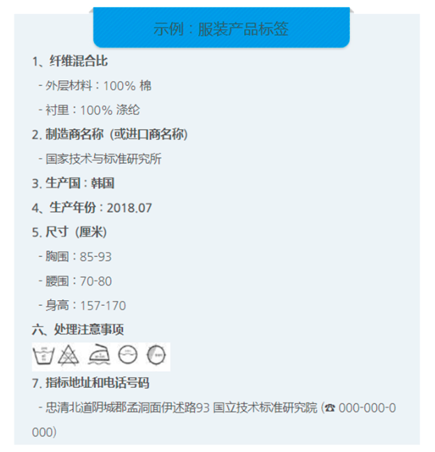 B.符合安全標(biāo)準(zhǔn)的家用紡織品無須加貼KC標(biāo)志,但應(yīng)標(biāo)明各項(xiàng)安全標(biāo)準(zhǔn)規(guī)定的標(biāo)識事項(xiàng)。服裝產(chǎn)品標(biāo)簽示例如下。