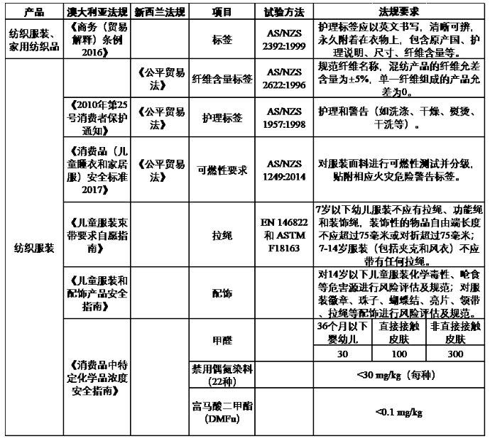 新西蘭《公平貿(mào)易法》規(guī)定兒童睡衣和其他家居服須符合AS/NZS1249:2014《兒童產(chǎn)品安全法案(兒童睡衣和家居服減少火災(zāi)危害)》及AS/NZS1182:1997《嬰兒和兒童服裝內(nèi)衣和外套的尺寸編碼方案》。同時(shí)該法規(guī)還對紡織品纖維含量標(biāo)簽和護(hù)理標(biāo)簽提出了規(guī)定,必須符合AS/NZS2622:1996《紡織產(chǎn)品纖維成分標(biāo)簽》(其中天然纖維和人造纖維的名稱參見AS/NZS2450《紡織品天然纖維和人造纖維通用名稱》)和AS/NZS1957《紡織品護(hù)理標(biāo)簽》。
