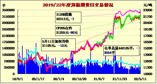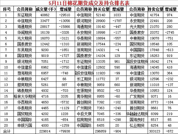5月11日,隔夜鄭棉增倉下探,今日早盤在空頭回補盤支撐下回穩(wěn),午后上沖回落,日線形成小陽線。日內(nèi)成交量萎縮,持倉量略有減少。