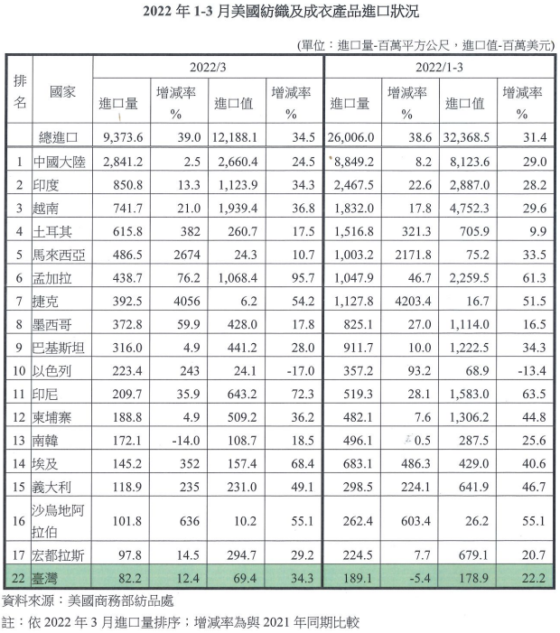 以2022年1-3月進口值分析,中國仍為美國最大的紡織品及成衣供應(yīng)國,占25.1%,其次是越南,占14.7%。在美國前十大成衣供應(yīng)國中,自孟加拉國、印度尼西亞進口分別較去年同期成長62.2%、62.3%,自印度、巴基斯坦進口也成長53-54%;另自洪都拉斯進口則僅成長21.1%。在美國前十大紡織品供應(yīng)國中,自柬埔寨進口激增74.4%,自越南進口成長25.7%,自土耳其進口減少5%。