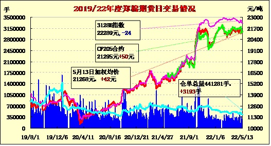 5月13日,隔夜鄭棉下試后回穩(wěn),今日早盤增量沖高后寬幅震蕩,日線形成長(zhǎng)下影線的陽(yáng)線。日內(nèi)成交量放大,持倉(cāng)量略有增加。據(jù)USDA最新月報(bào)顯示,或因旱情持續(xù)不見(jiàn)好轉(zhuǎn),西南棉區(qū)預(yù)期棄耕率較高等影響,美國(guó)2022/23年度產(chǎn)量大幅調(diào)減,同比減幅在5.8%,加之出口預(yù)期顯著調(diào)增,期末庫(kù)存大幅減少,同比減幅達(dá)14.7%,或支撐棉價(jià)大幅上漲。此外,在外圍谷物市場(chǎng)走高提振之下,期棉漲勢(shì)延續(xù)。