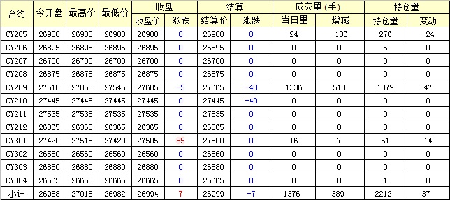 主力CY209合約當日交易走勢