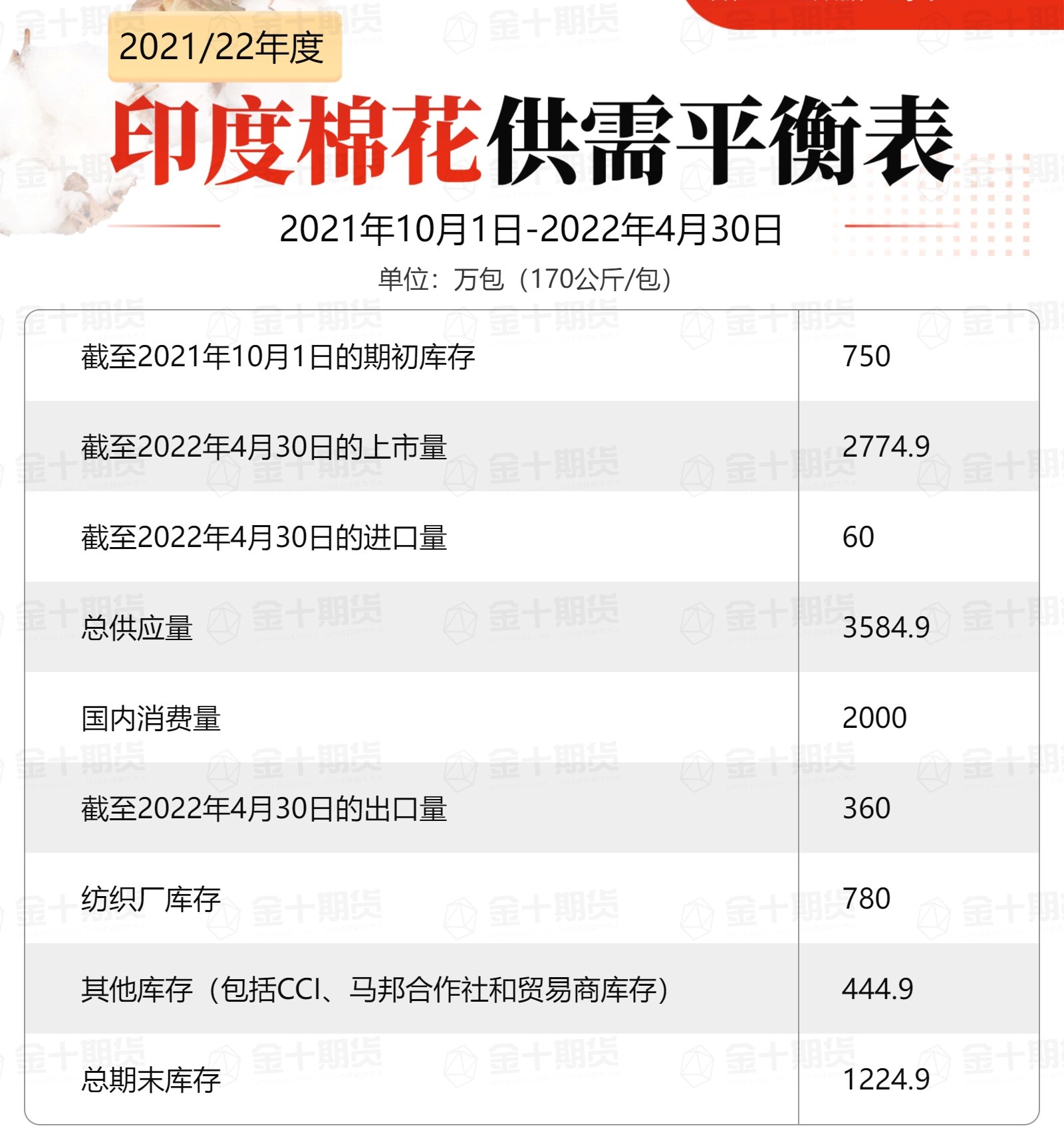 印度棉花協(xié)會:2021年10月至2022年4月期間供需平衡表。印度棉花供應(yīng)總量為3584.9萬包,其中新棉上市量2774.9萬包,進口量60萬包,期初庫存750萬包;印度國內(nèi)消費量為2000萬包,出口量360萬包;期末庫存為1224.9萬包,其中紡織廠780萬包,其他渠道444.9萬包(CCI、馬邦合作社和貿(mào)易商庫存)。