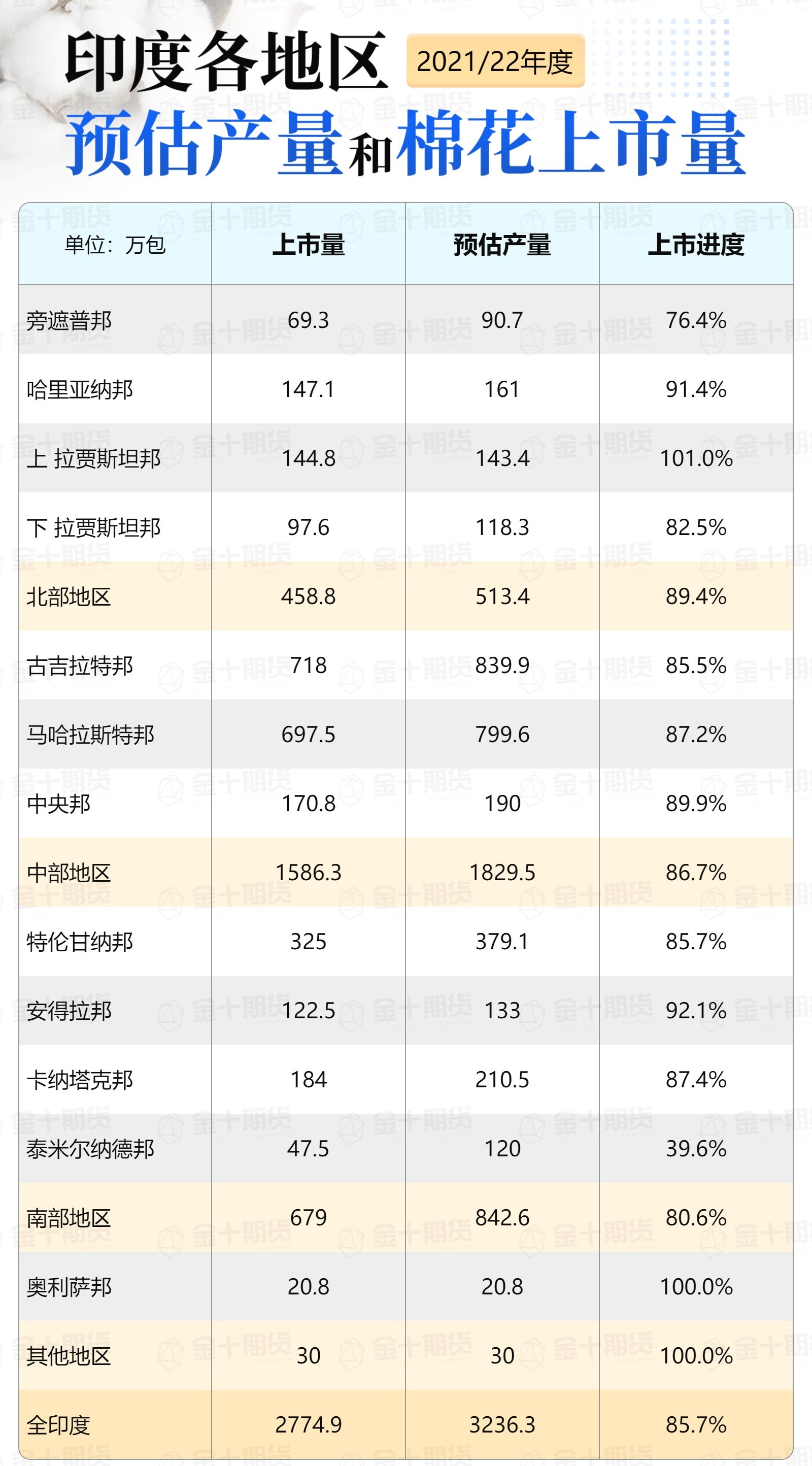 印度各地區(qū)2021/22年度棉花預(yù)估產(chǎn)量及上市量。