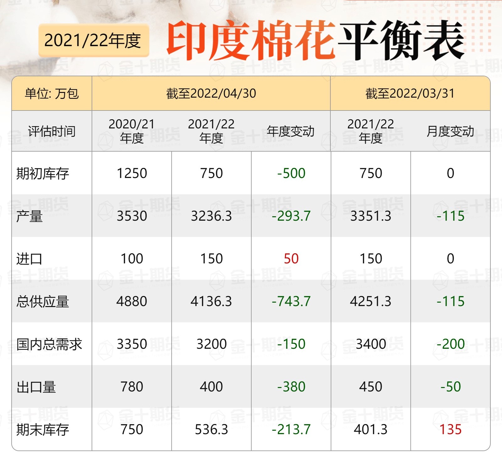 印度棉花協(xié)會公布最新預(yù)測數(shù)據(jù),2021/22年度印度棉花期初庫存預(yù)期750萬包,環(huán)比3月持平;2021/22年度印度棉花產(chǎn)量預(yù)期3236.3萬包,環(huán)比3月下調(diào)115萬包;2021/22年度印度棉花進口預(yù)期150萬包,環(huán)比3月持平;2021/22年度印度棉花總供應(yīng)量預(yù)期4136.3萬包,環(huán)比3月下調(diào)115萬包;2021/22年度印度棉花國內(nèi)總需求預(yù)期3200萬包,環(huán)比3月下調(diào)200萬包;2021/22年度印度棉花出口量預(yù)期400萬包,環(huán)比3月下調(diào)50萬包;2021/22年度印度棉花期末庫存預(yù)期536.3萬包,環(huán)比3月上調(diào)135萬包。(注意:1包等于170公斤)