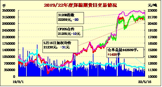 5月16日,隔夜鄭棉下試后回穩(wěn),今日早盤在空頭回補(bǔ)推動(dòng)下反抽,盤中區(qū)間震蕩,尾盤在集中回補(bǔ)盤作用下收強(qiáng),日線形成陽線星。日內(nèi)成交量萎縮,持倉量略有減少。