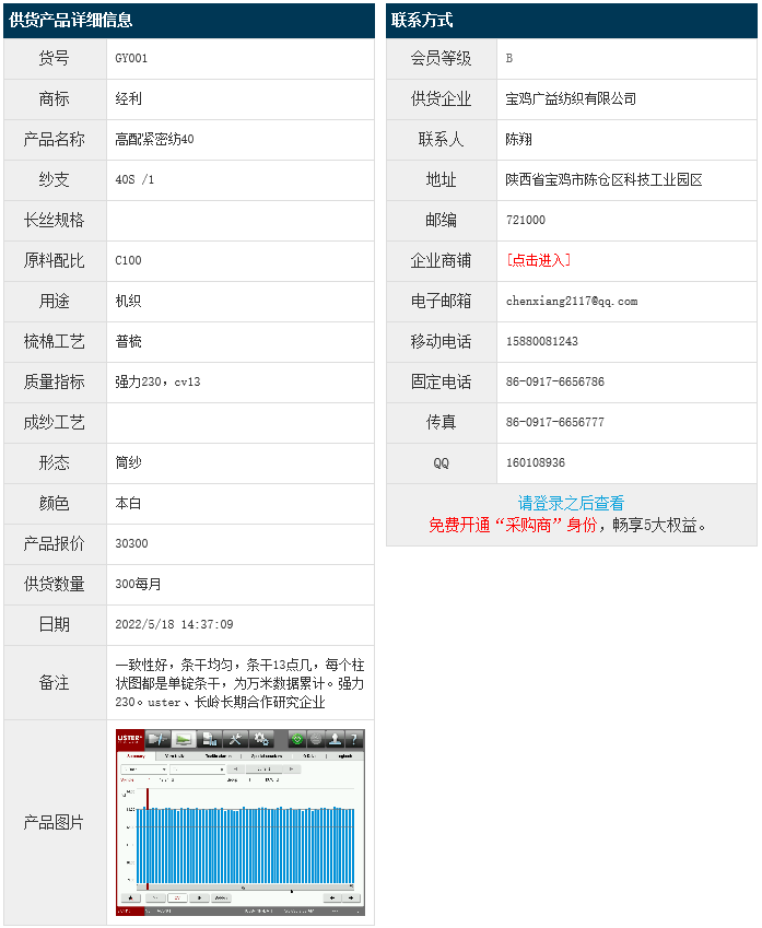 5月18日,寶雞廣益紡織有限公司機(jī)織高配緊密紡純棉紗C100 40S 強(qiáng)力230 cv13,報(bào)價(jià)為30300元/噸,實(shí)際成交價(jià)以協(xié)商為準(zhǔn)。[點(diǎn)擊查看詳情]