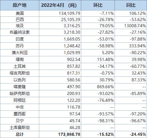 據(jù)海關(guān)統(tǒng)計數(shù)據(jù),2022年4月我國進(jìn)口棉花約17萬噸,環(huán)比減少約4萬噸,同比下降約24.5%。