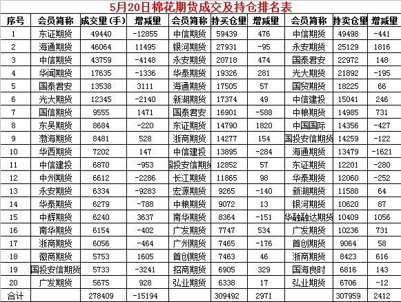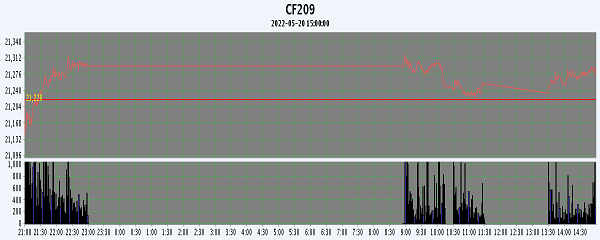 5月20日,隔夜鄭棉低開,盤中在空頭回補的推動下走高,隨后調(diào)整,午后回穩(wěn)橫盤,日線形成陽線。日內(nèi)成交量萎縮,持倉量變化不大。