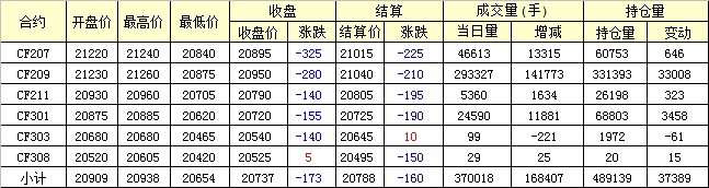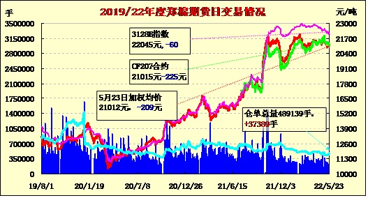 5月23日,上周五紐約棉花期貨大幅收跌,隔夜鄭棉低開盤整,今日早盤在空頭賣盤增倉打壓下走低,盤中低位震蕩,午后在空頭回補盤支撐下脫離低點,日線形成長陰線。日內(nèi)成交量放大,持倉量增加。