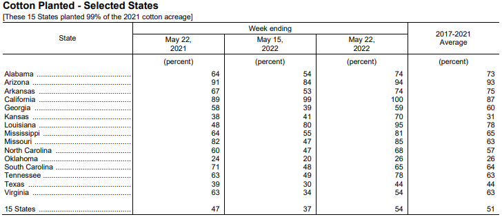 美國(guó)農(nóng)業(yè)部5月23日發(fā)布的美國(guó)棉花生長(zhǎng)報(bào)告顯示,截至5月22日當(dāng)周,美棉種植率為54%,前周為37%,去年同期為47%,5年均值為51%。