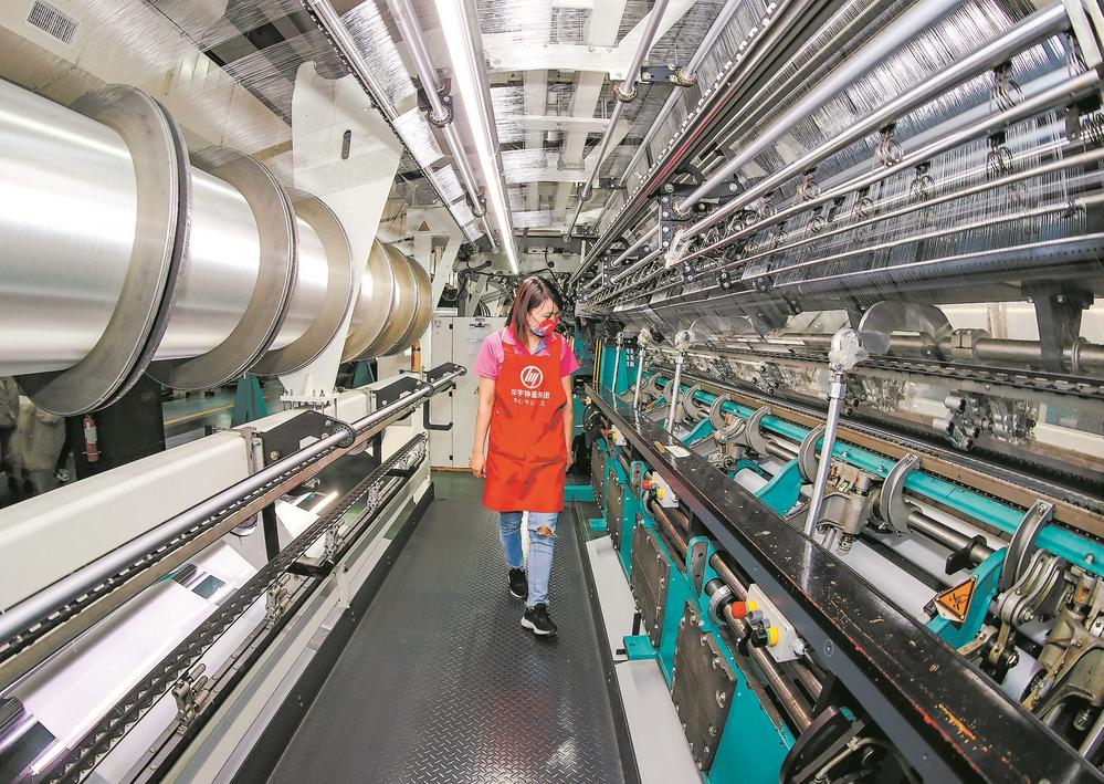 連日來(lái),晉江市華宇錚鎣集團(tuán)生產(chǎn)車間里,經(jīng)編設(shè)備飛速運(yùn)行,紅外自停裝置實(shí)時(shí)在線檢測(cè),第一時(shí)間處理斷紗等問(wèn)題,保障生產(chǎn)不停頓。全面復(fù)工復(fù)產(chǎn)的華宇錚鎣集團(tuán),網(wǎng)布全廠日產(chǎn)能達(dá)100多噸,目前該公司900多臺(tái)設(shè)備開(kāi)足馬力,釋放最大產(chǎn)能,訂單已排至8月。圖為工人在看管設(shè)備。