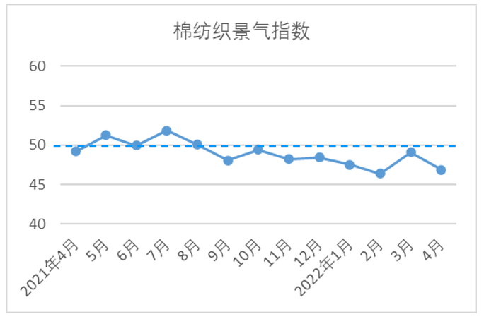 說明:中國(guó)棉紡織行業(yè)景氣指數(shù)采集自全國(guó)近500家次棉紡織企業(yè),參考國(guó)家制造業(yè)PMI等指數(shù)制定方式,通過對(duì)多個(gè)主要指標(biāo)加權(quán)計(jì)算得出,當(dāng)指數(shù)高于50,表示棉紡織行業(yè)本月景氣程度好于上月,低于50則表示本月景氣程度不及上月。
