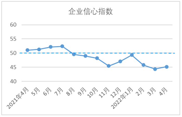 4月,企業(yè)信心指數(shù)45.19,較3月上升0.8,位于枯榮線下方。4月,俄烏沖突持續(xù),美國(guó)高通脹外溢,擾亂全球經(jīng)濟(jì)金融秩序,國(guó)際貨幣基金組織(IMF)在最新發(fā)布的《全球經(jīng)濟(jì)展望報(bào)告》(WEO)中再次下調(diào)2022年全球經(jīng)濟(jì)增速預(yù)期0.8個(gè)百分點(diǎn)至3.6%,國(guó)內(nèi)雖受到疫情沖擊,對(duì)經(jīng)濟(jì)運(yùn)行造成不利影響,但隨著疫情逐步得到控制,生產(chǎn)生活秩序?qū)⒒謴?fù)到正常的狀態(tài),前期被壓抑的消費(fèi)也將會(huì)逐步得到釋放。對(duì)于后市,一些企業(yè)仍抱有信心,期望5月市場(chǎng)能有所好轉(zhuǎn)。調(diào)查數(shù)據(jù)顯示,認(rèn)為后市樂觀向好的企業(yè)占比為10.37%,較3月增加2.76個(gè)百分點(diǎn);認(rèn)為后市弱勢(shì)下行的企業(yè)占比為67.23%。