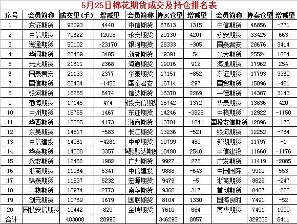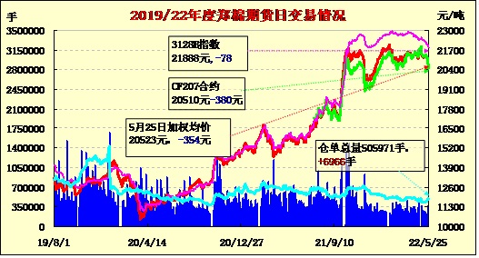 5月25日,隔夜鄭棉平開盤跌,今日早盤在空頭賣盤增倉打壓下持續(xù)走低,午后創(chuàng)日低,隨后在多頭買盤和空頭回補(bǔ)盤支撐下脫離低點(diǎn)反彈,日線形成1/2下影線的陰線。日內(nèi)成交量放大,持倉量增加。