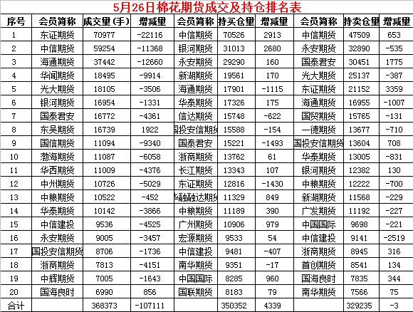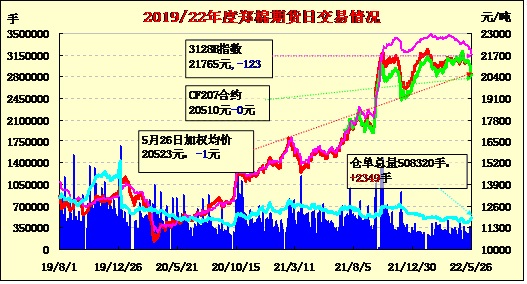5月26日,隔夜鄭棉高開下滑,今日早盤在空頭賣盤打壓下走低,隨后空頭回補(bǔ)支撐期價(jià)反抽,午后橫盤,日線形成高開陰線。日內(nèi)成交量萎縮,持倉(cāng)量增加。
