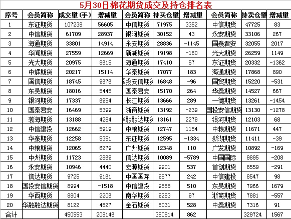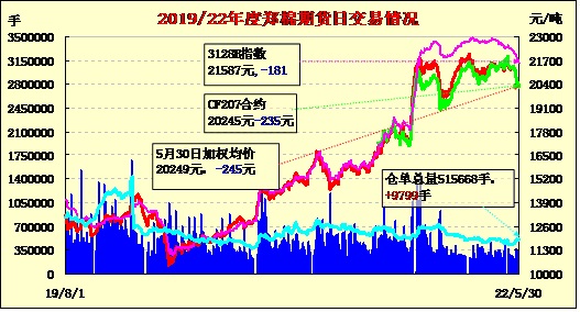 5月30日,上周五紐約棉花期貨收跌,隔夜鄭棉平開震蕩,今日早盤反彈后在空頭賣盤壓制下走低,此后低位震蕩,日線形長陰線。日內(nèi)成交量放大,持倉量增加。