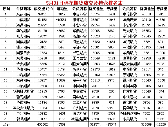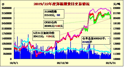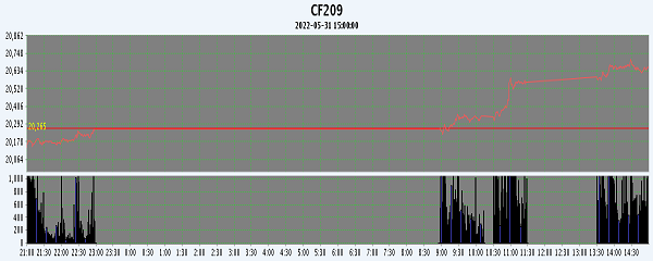 5月31日,周一紐約棉花期貨休市,隔夜鄭棉高開盤升,今日盤中受空頭集中回補(bǔ)買盤推動上行,日線形長陽線。日內(nèi)成交量與前一日基本持平,持倉量大幅減少。