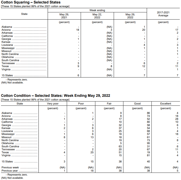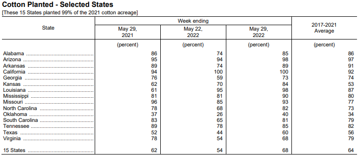 美國(guó)農(nóng)業(yè)部5月31日發(fā)布的美國(guó)棉花生長(zhǎng)報(bào)告顯示,截至5月29日當(dāng)周,美棉種植率為68%,前周為54%,去年同期為62%,5年均值為64%。