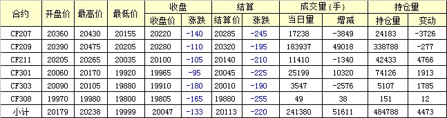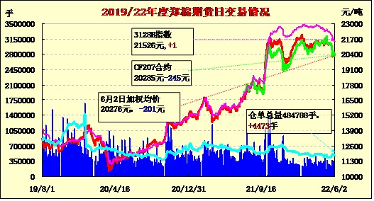 6月2日,隔夜鄭棉低開反彈后震蕩盤跌,今日早盤在空頭賣盤壓制下震蕩下行,午后受到空頭回補支撐止跌震蕩,日線形成小陰線。日內(nèi)成交量放大,持倉量略有減少。