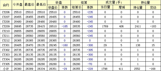 主力CY209合約當日交易走勢
