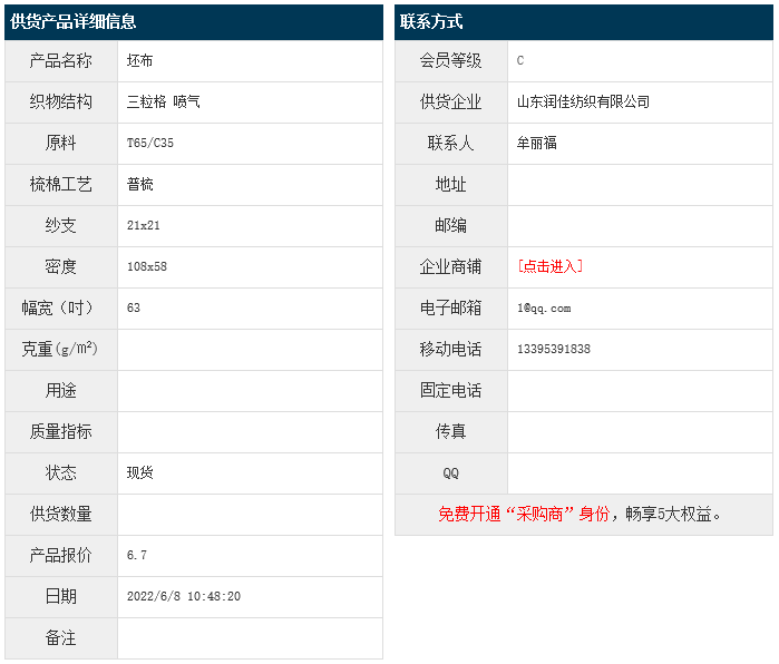 6月8日,山東潤(rùn)佳紡織有限公司滌棉三粒格T65/C35 21x21 108x58 63" 噴氣,報(bào)價(jià)為6.7元/米,實(shí)際成交價(jià)以協(xié)商為準(zhǔn)。[點(diǎn)擊查看詳情]