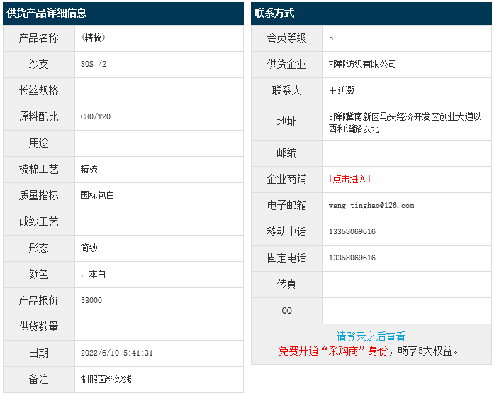 6月9日,邯鄲紡織有限公司制服面料滌棉紗JCVC80/20 80S/2,報價為53000元/噸,實際成交價以協(xié)商為準。[點擊查看詳情]