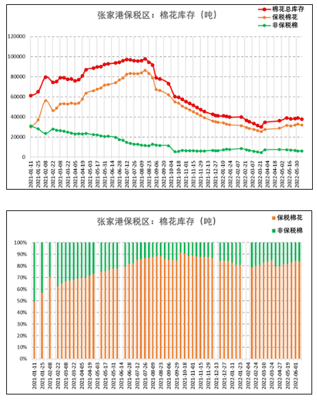 據(jù)張家港保稅區(qū)紡織原料市場統(tǒng)計,截至6月9日當(dāng)周,張家港保稅區(qū)棉花總庫存3.77萬噸,環(huán)比減少2.8%;其中保稅棉3.2萬噸,環(huán)比減少3.1%,非保稅棉0.6萬噸,環(huán)比減少1.4%。從進口棉來源地看,張家港保稅區(qū)棉花庫存中:美棉占比14%,環(huán)比增加2.2百分點;巴西棉占比36.1%,環(huán)比增加0.4個百分點;印度棉占比41.1%,環(huán)比減少0.4個百分點;其他國家及地區(qū)占比8.7%,環(huán)比減少2.1個百分點。當(dāng)周進口棉進出入庫動態(tài)變化情況,張家港保稅區(qū)棉花庫存中,出庫1469噸,入庫2164噸,凈入庫(+695)噸。