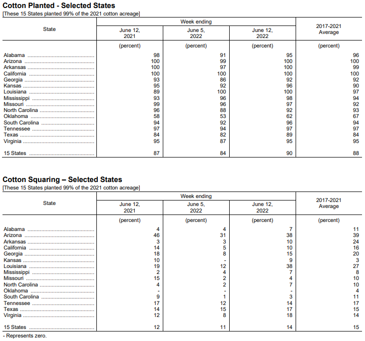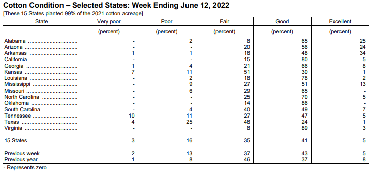美國農(nóng)業(yè)部6月13日發(fā)布的美國棉花生長報告顯示,截至6月12日當(dāng)周,美棉種植率為90%,前周為84%,去年同期為87%,五年均值為88%。美棉現(xiàn)蕾率為14%,前周為11%,去年同期為12%,五年均值為15%。美棉生長優(yōu)良率為46%,前周為48%,去年同期為45%。