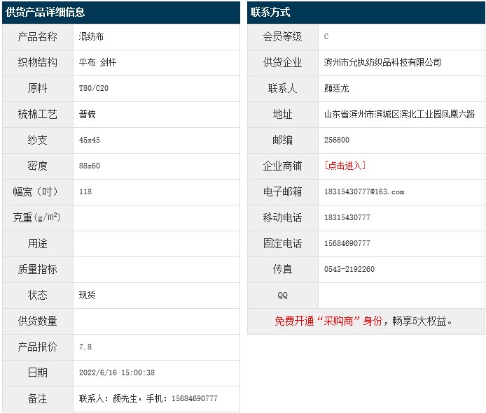 6月16日,濱州允執(zhí)紡織品科技有限公司滌棉平布T80/C20 45x45 88x60 118" 劍桿,報(bào)價(jià)為7.8元/米,實(shí)際成交價(jià)以協(xié)商為準(zhǔn)。[點(diǎn)擊查看詳情]