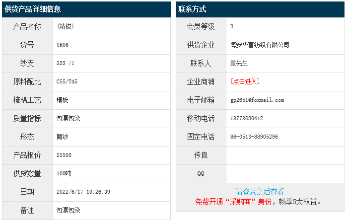 6月17日,海安華富紡織有限公司滌棉紗JCVC55/45 32S,報(bào)價(jià)為25500元/噸,實(shí)際成交價(jià)以協(xié)商為準(zhǔn)。[點(diǎn)擊查看詳情]