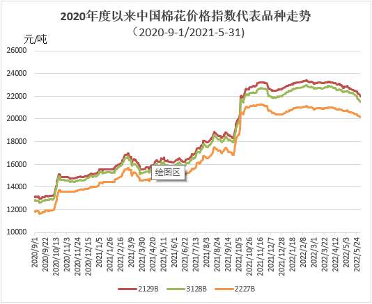 5月,鄭棉月初在外盤帶動(dòng)下小幅上漲,月中下旬國內(nèi)供大于需格局未改,盤面震蕩下行。國內(nèi)棉花現(xiàn)貨價(jià)格隨之下跌,棉企迫于還貸壓力降價(jià)促銷,紡織廠逢低適量補(bǔ)充庫存,需求略好于上月,但整體購銷進(jìn)度依然緩慢。月末,中國棉花價(jià)格指數(shù)(CCIndex3128B)21519元/噸,環(huán)比下跌907元;月均價(jià)22122元/噸,環(huán)比下跌496元,同比上漲6556元。