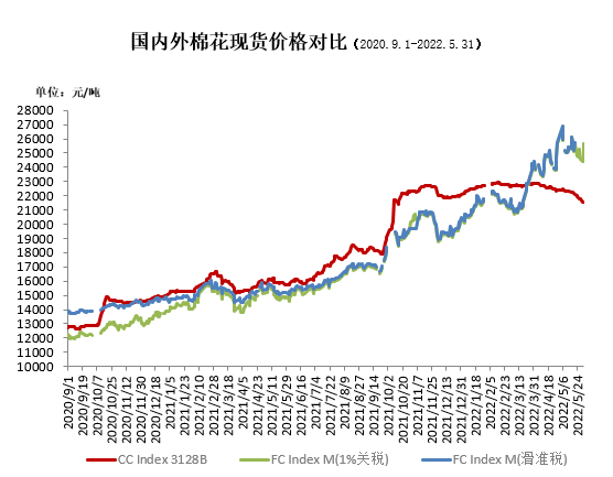5月,受USAD報(bào)告全球棉花供需偏緊、美棉出口需求整體強(qiáng)勁等因素支撐,國際棉價(jià)先揚(yáng)后抑,全月仍大幅上漲,其中CotlookA指數(shù)在月初最高突破170美分。中國進(jìn)口棉價(jià)格指數(shù)FCIndexM月均161.74美分/磅,環(huán)比上漲6.45美分;月底155.98美分/磅,環(huán)比下跌8.46美分,1%關(guān)稅下折人民幣24427元/噸,高于同期國內(nèi)現(xiàn)貨2908元,內(nèi)外棉價(jià)價(jià)差加大。
