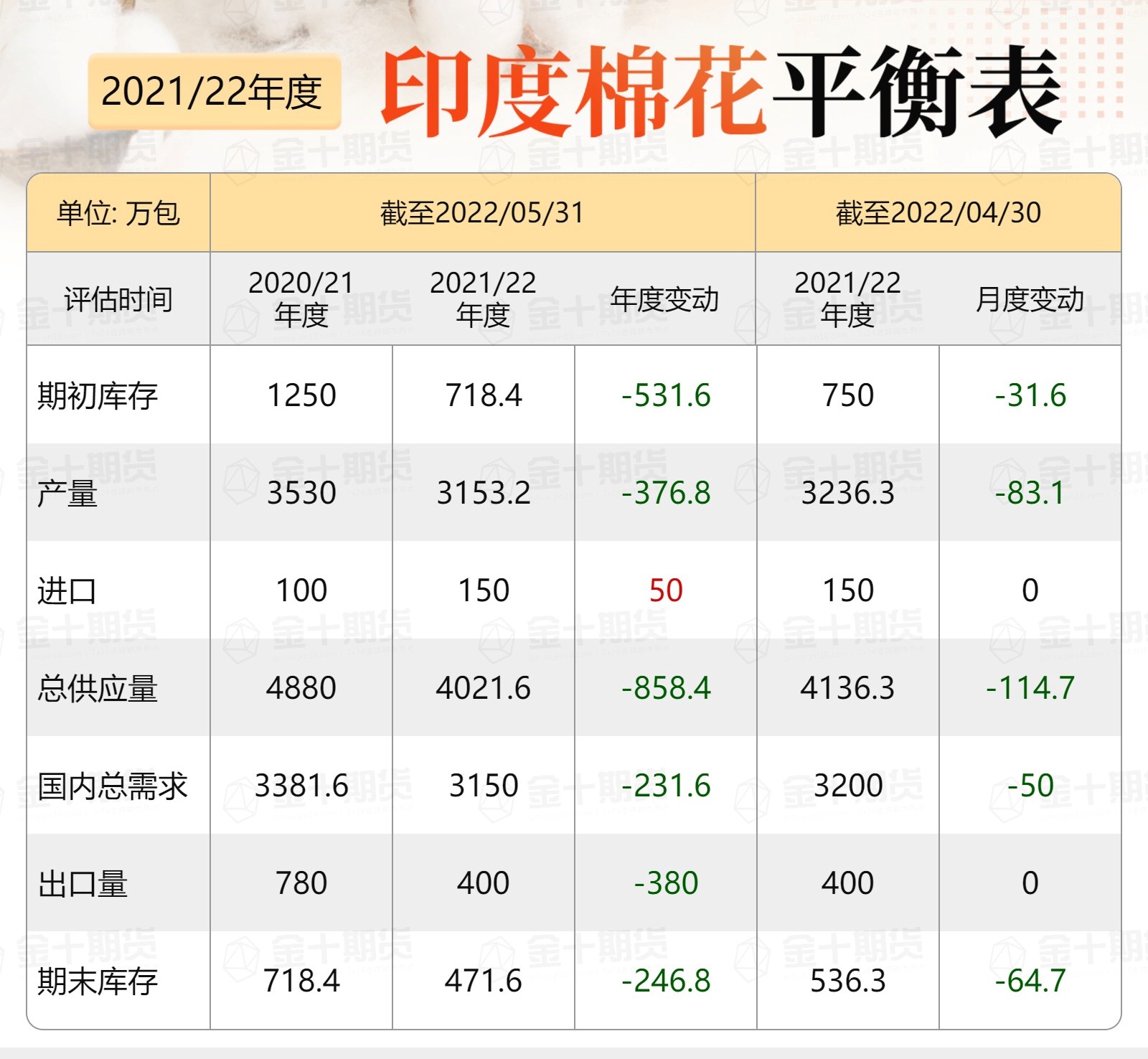 印度棉花協(xié)會公布最新預測數(shù)據(jù),2021/22年度印度棉花期初庫存預期718.4萬包,環(huán)比下調(diào)31.6萬包;2021/22年度印度棉花產(chǎn)量預期3153.2萬包,環(huán)比下調(diào)83.1萬包;2021/22年度印度棉花進口預期150萬包,環(huán)比持平;2021/22年度印度棉花總供應(yīng)量預期4021.6萬包,環(huán)比下調(diào)114.7萬包;2021/22年度印度棉花國內(nèi)總需求預期3150萬包,環(huán)比下調(diào)50萬包;2021/22年度印度棉花出口量預期400萬包,環(huán)比持平;2021/22年度印度棉花期末庫存預期471.6萬包,環(huán)比下調(diào)64.7萬包。(注意:1包等于170公斤)