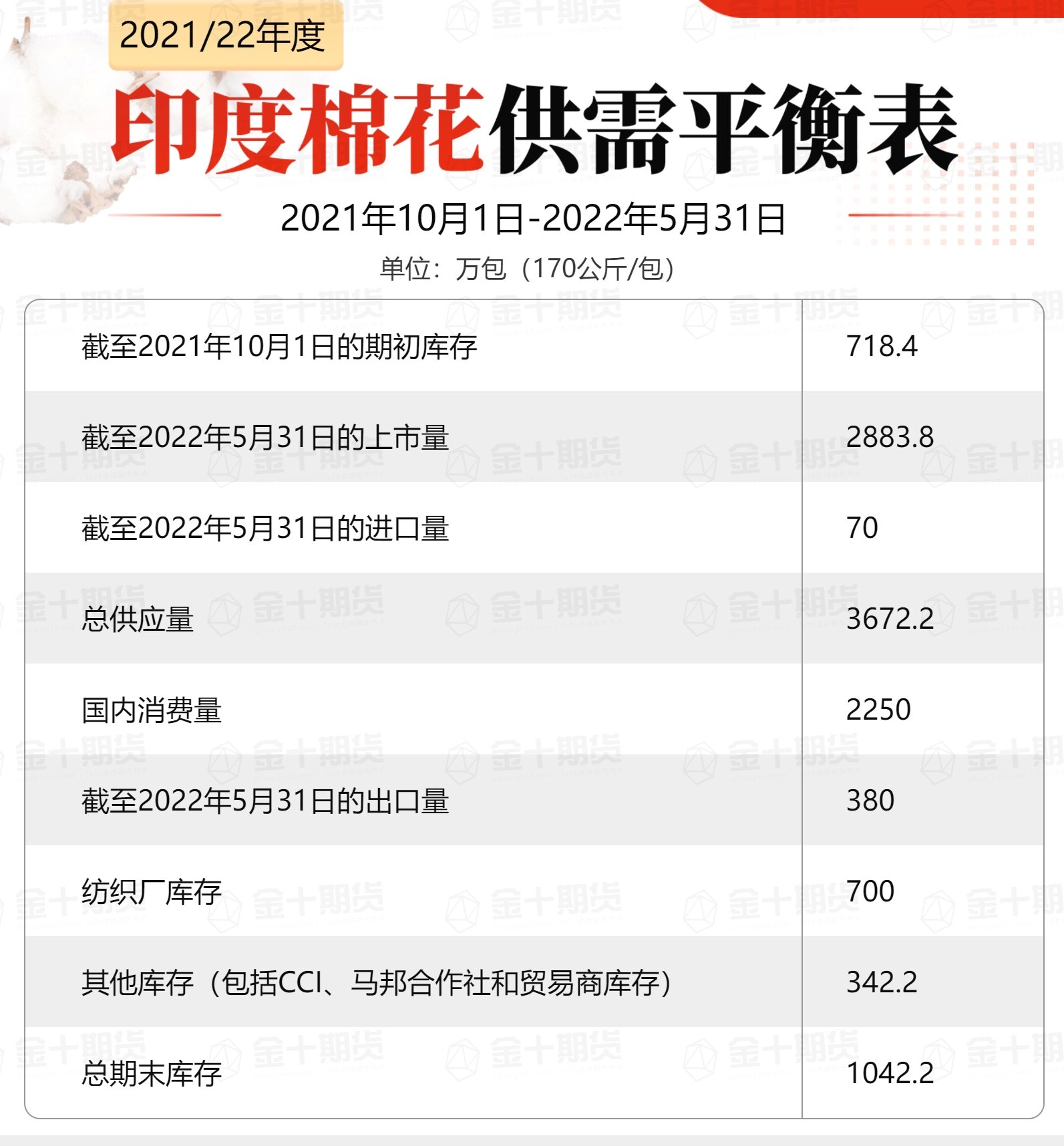 印度棉花協(xié)會:2021年10月1日至2022年5月31日期間供需平衡表。印度棉花供應(yīng)總量為3672.2萬包,其中新棉上市量2883.8萬包,進口量70萬包,期初庫存718.4萬包;印度國內(nèi)消費量為2250萬包,出口量380萬包;期末庫存為1042.2萬包,其中紡織廠700萬包,其他渠道342.2萬包(CCI、馬邦合作社和貿(mào)易商庫存)。(注意:1包等于170公斤)