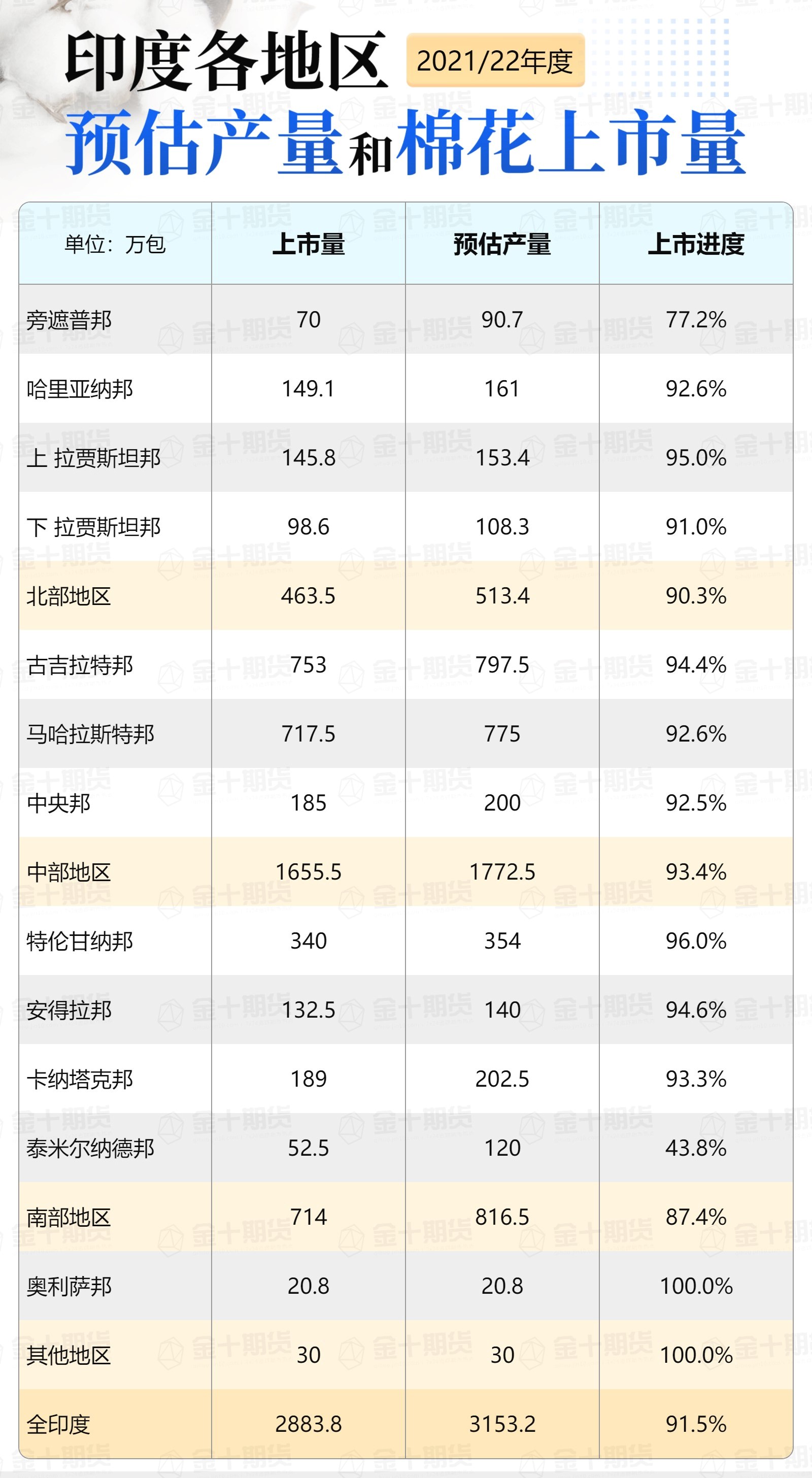 印度各地區(qū)2021/22年度棉花預估產(chǎn)量及上市量