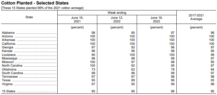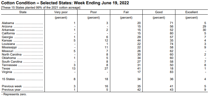 美國農業(yè)部6月21日發(fā)布的美國棉花生長報告顯示,截至6月19日當周,美棉種植率為96%,前周為90%,去年同期為95%,五年均值為95%。美棉現(xiàn)蕾率為22%,前周為14%,去年同期為20%,五年均值為23%。美棉結鈴率為6%,去年同期為4%,五年均值為4%,美棉生長優(yōu)良率為40%,前周為46%,去年同期為52%。
