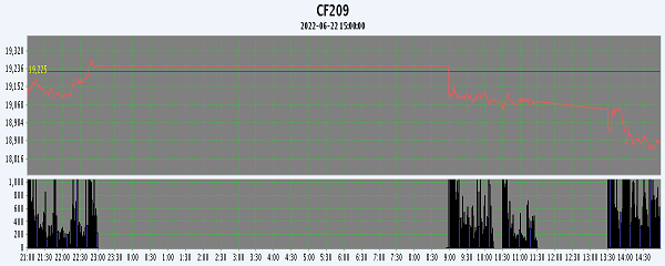 6月22日,周二紐約棉花期貨大幅收跌,隔夜鄭棉CF09、01合約探低回穩(wěn),今日早盤在空頭賣盤壓制下走低,盤中增倉(cāng)盤跌,午后期價(jià)一度在多頭買盤支撐下反彈,但是隨后空頭增量賣盤壓制期價(jià)回落,尾盤低位震蕩,日線形成陰線。日內(nèi)成交量放大,持倉(cāng)量增加。