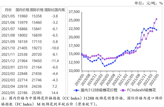 (一)國內(nèi)棉價繼續(xù)下跌。本月,棉花加工企業(yè)降價去庫存意愿明顯,但下游紡織市場低迷態(tài)勢未見改善,棉花采購意愿偏低。據(jù)《中國棉花工業(yè)庫存調(diào)查報告》數(shù)據(jù),5月初,準備采購棉花的企業(yè)占52%,比近五年同期平均水平減少17.7個百分點。5月,國內(nèi)3128B級棉花月均價每噸22186元,環(huán)比跌1.9%,同比漲39.0%。鄭棉期貨主力合約(CF209)月結算價每噸21203元,環(huán)比跌1.4%,同比漲34.4%。