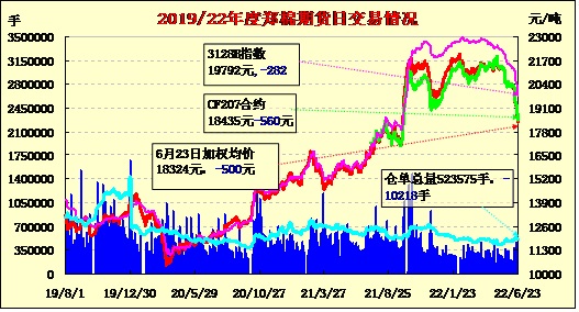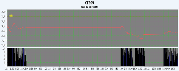 6月23日,周三紐約棉花期貨再度收跌,隔夜鄭棉CF09、01合約低開震蕩,今日早盤在空頭賣盤和多頭平倉盤壓制下走低,午后在短線空頭回補支撐下止跌反彈后窄幅震蕩,日線形成1/2下影線的陰線。日內(nèi)成交量放大,持倉量減少。美國當?shù)貢r間周三美聯(lián)儲主席鮑威爾在聽證會上表示,將堅定地致力于使用貨幣政策工具降低通貨膨脹。高通脹、貨幣緊縮政策下,近期市場對美國經(jīng)濟衰退擔憂不斷加劇,外圍金融能源谷物市場全面收跌,棉價承壓下挫。