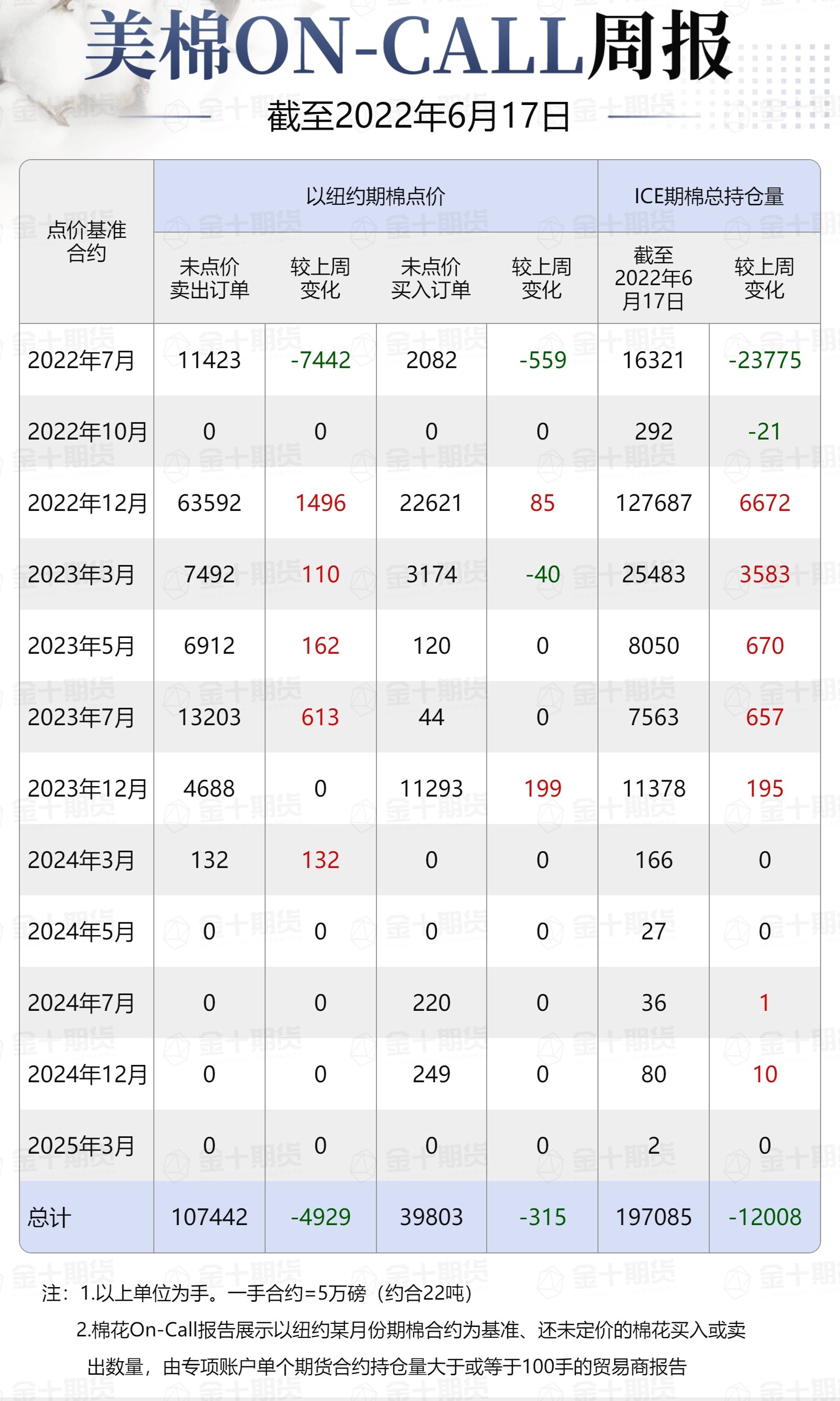 ①美棉On-Call未點(diǎn)價(jià)賣(mài)出訂單107442手,環(huán)比減少4929手;未點(diǎn)價(jià)買(mǎi)入訂單39803手,環(huán)比減少315手;