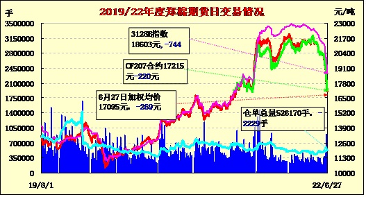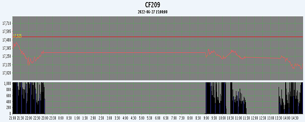 6月27日,隔夜鄭棉CF09、01合約高開后下滑,今盤中低位震蕩,遠(yuǎn)月創(chuàng)新低,日線形成陰線。日內(nèi)成交量下降,持倉(cāng)量近減遠(yuǎn)增。美棉新年度簽約出口勢(shì)頭有所減弱,本年度陸地棉簽約量創(chuàng)下年內(nèi)最低。6.10-16日一周美國(guó)2021/22年度陸地棉凈簽約3674噸,較前周大幅減少39%,較近四周平均減少90%,破年內(nèi)低點(diǎn),裝運(yùn)2021/22 年度陸地棉84346噸,較前周增加11%。凈簽約本年度皮馬棉295噸,較前周增加41%,裝運(yùn)皮馬棉1270噸,較前周減少15%。新年度陸地棉簽約62891噸,無(wú)新增皮馬棉簽約。