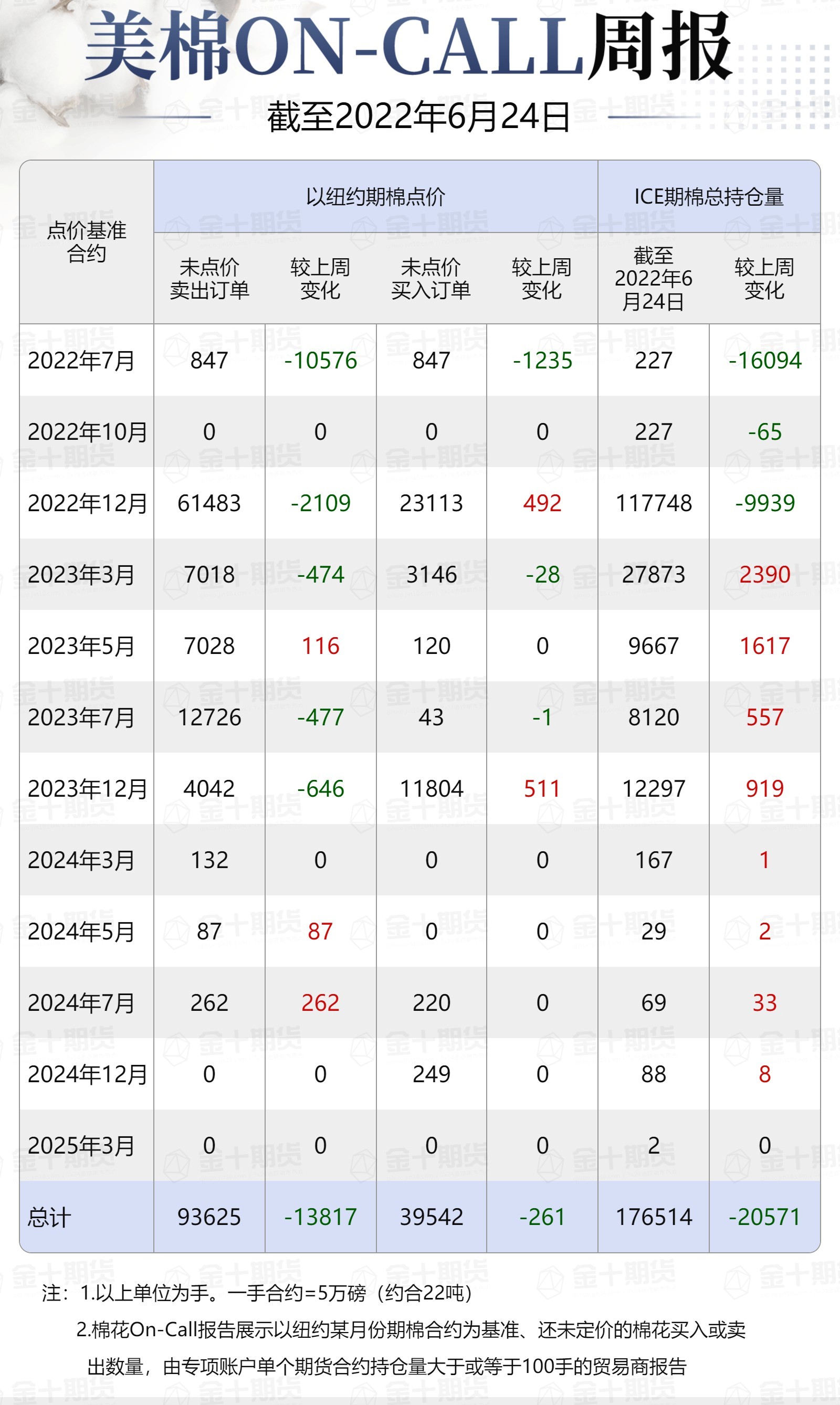 據(jù)美國(guó)商品期貨交易委員會(huì)(CFTC)最新數(shù)據(jù),截至6月24日,①美棉On-Call未點(diǎn)價(jià)賣出訂單93625手,環(huán)比減少13817手;未點(diǎn)價(jià)買入訂單39542手,環(huán)比減少261手;②ICE期棉2207合約上賣方未點(diǎn)價(jià)合約為847手,較此前一周減少10576手;③ICE棉花期貨盤面2021/22年度(8月至次年7月)的On-Call合約未點(diǎn)價(jià)賣出訂單為847手,環(huán)比減少10576手。