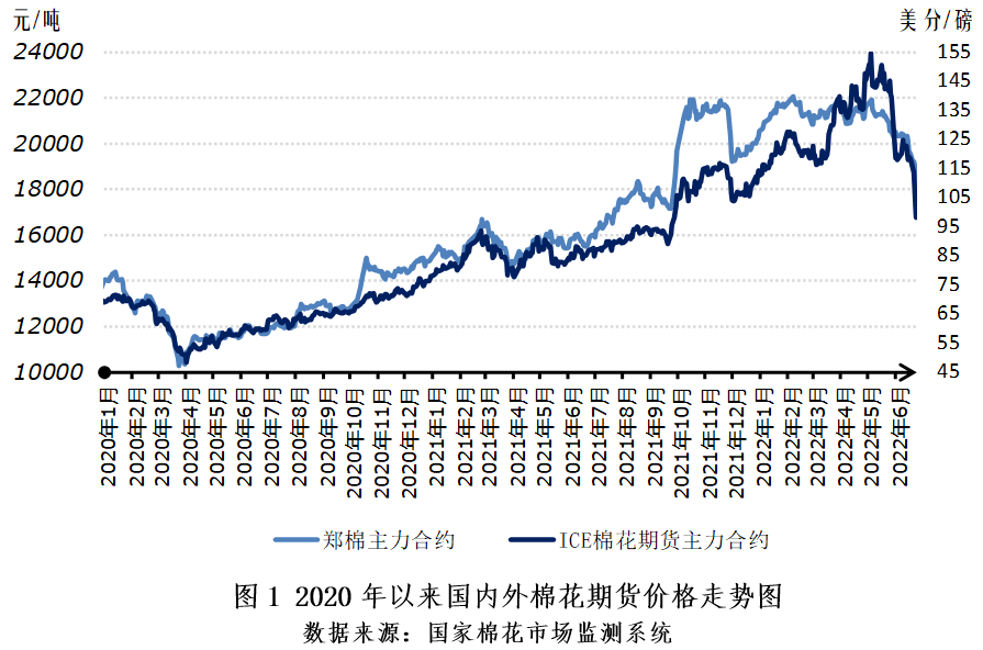 2022年6月以來,國內(nèi)紡織市場進(jìn)入淡季,6月21日起美國開始實(shí)施涉疆產(chǎn)品禁令,使得本就低迷的紡織市場“雪上加霜”,外圍金融環(huán)境進(jìn)一步印證我們在4月月報(bào)中提出的“環(huán)境急劇收縮”,多層因素疊加共同引爆國內(nèi)棉花期貨價格開啟連續(xù)暴跌模式。截至6月30日,代表內(nèi)地標(biāo)準(zhǔn)級皮棉市場價格的國家棉花價格B指數(shù)18330元/噸,較5月底下跌14.90%,鄭州商品交易所棉花期貨主力合約結(jié)算價17760元/噸,較5月底下跌13.15%。